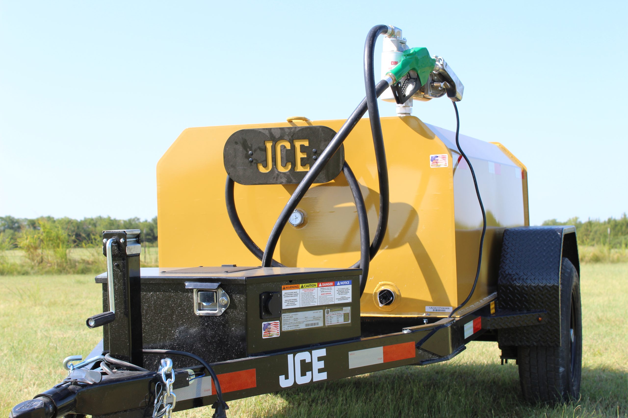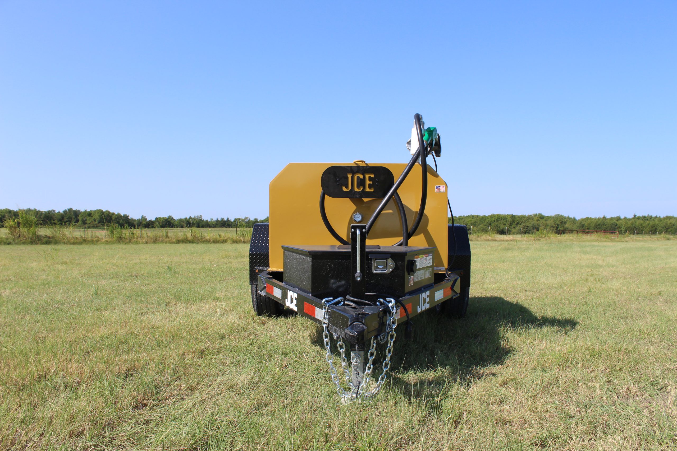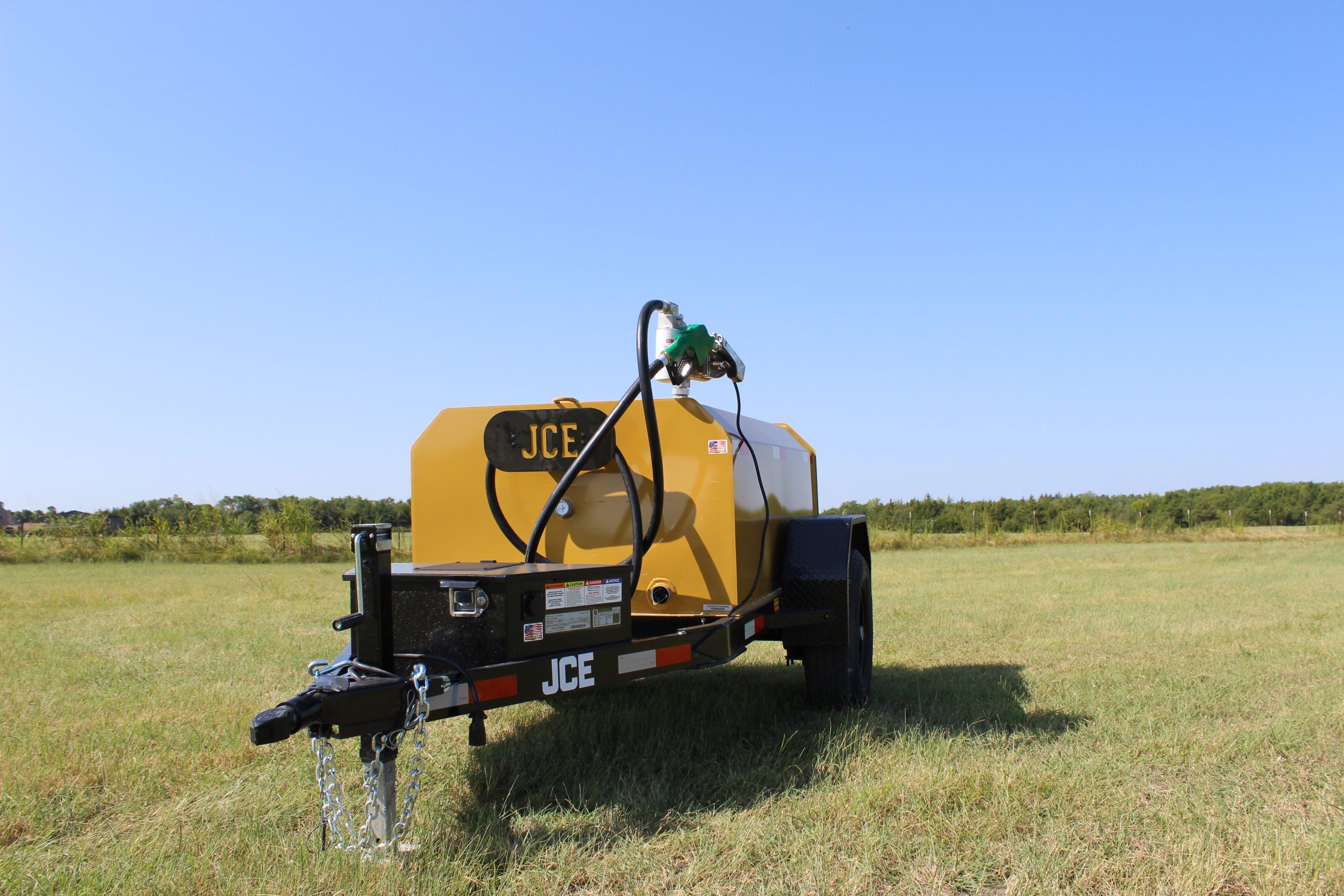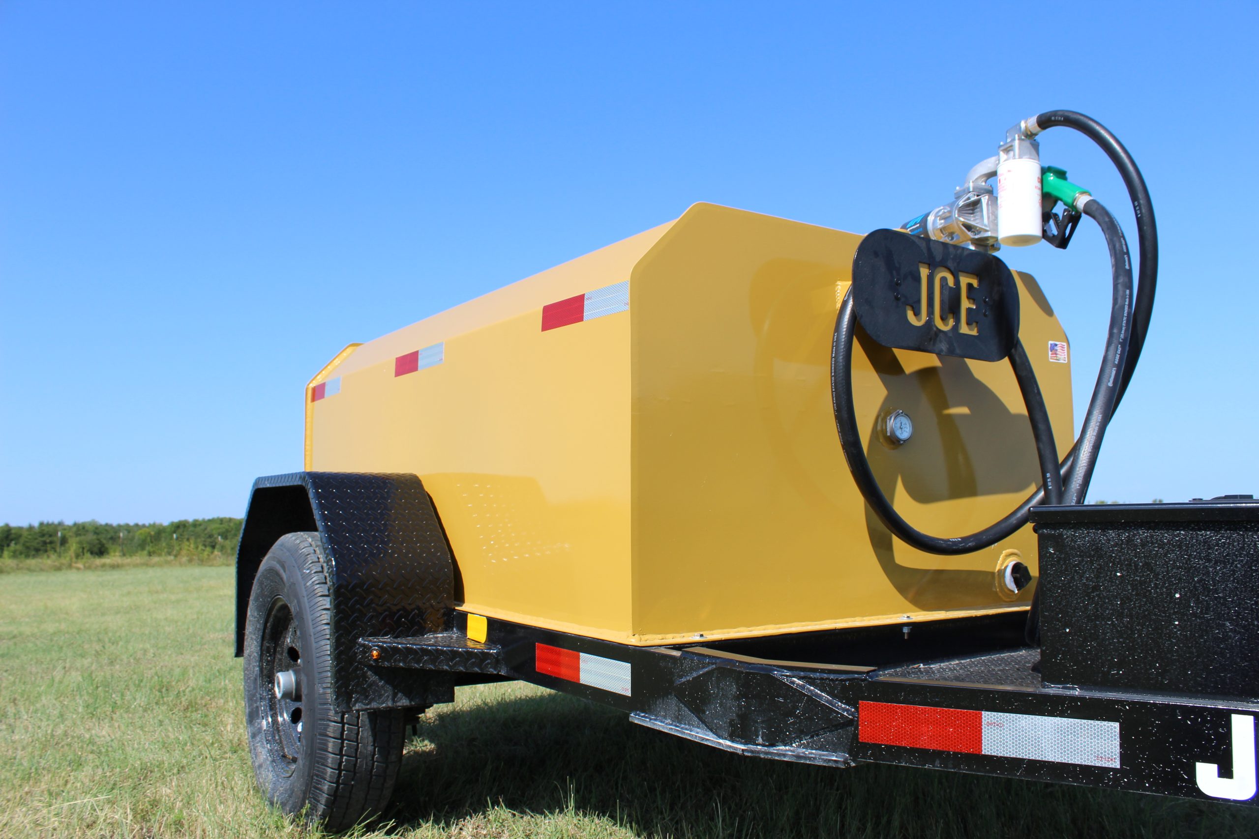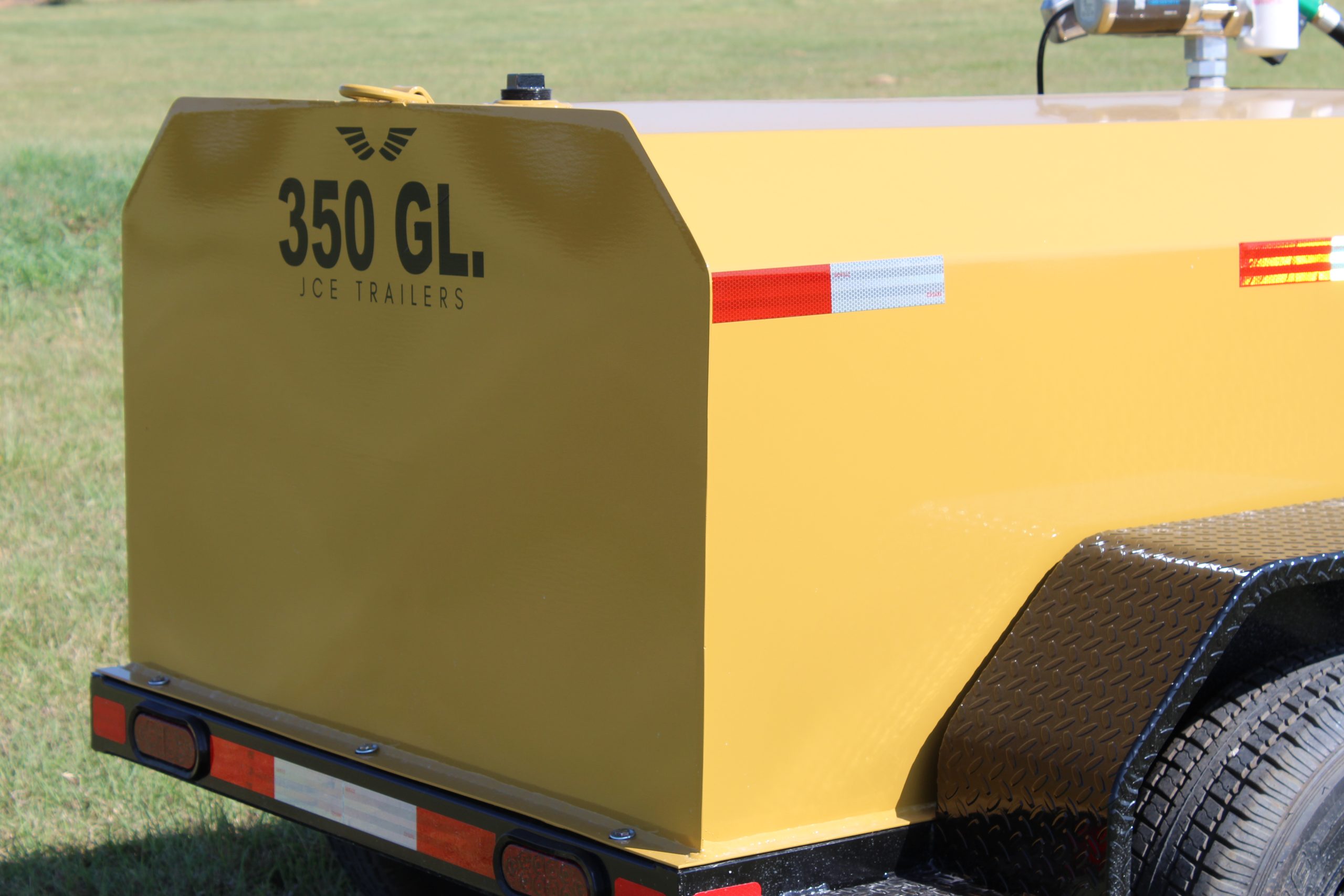 350-gallon steel fuel tank trailer with single 5.2K axle, 20 GPM pump, solar-charged electrical system, and 4″ channel frame construction.